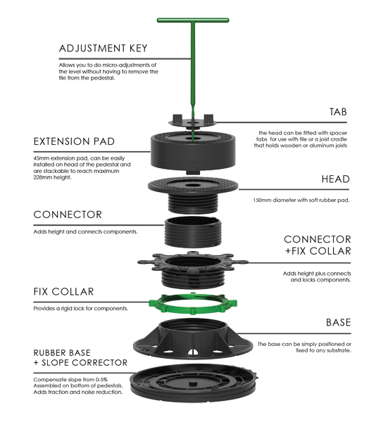 The raised access flooring installation system uses pedestals to provide easy access to the area underneath as well as improve drainage. This innovative flooring system is also ideal for applications that have uneven terrains or need to quickly and easily repair single pieces of the flooring. This system offers a more cost effective alternative to traditional decking and is more durable.