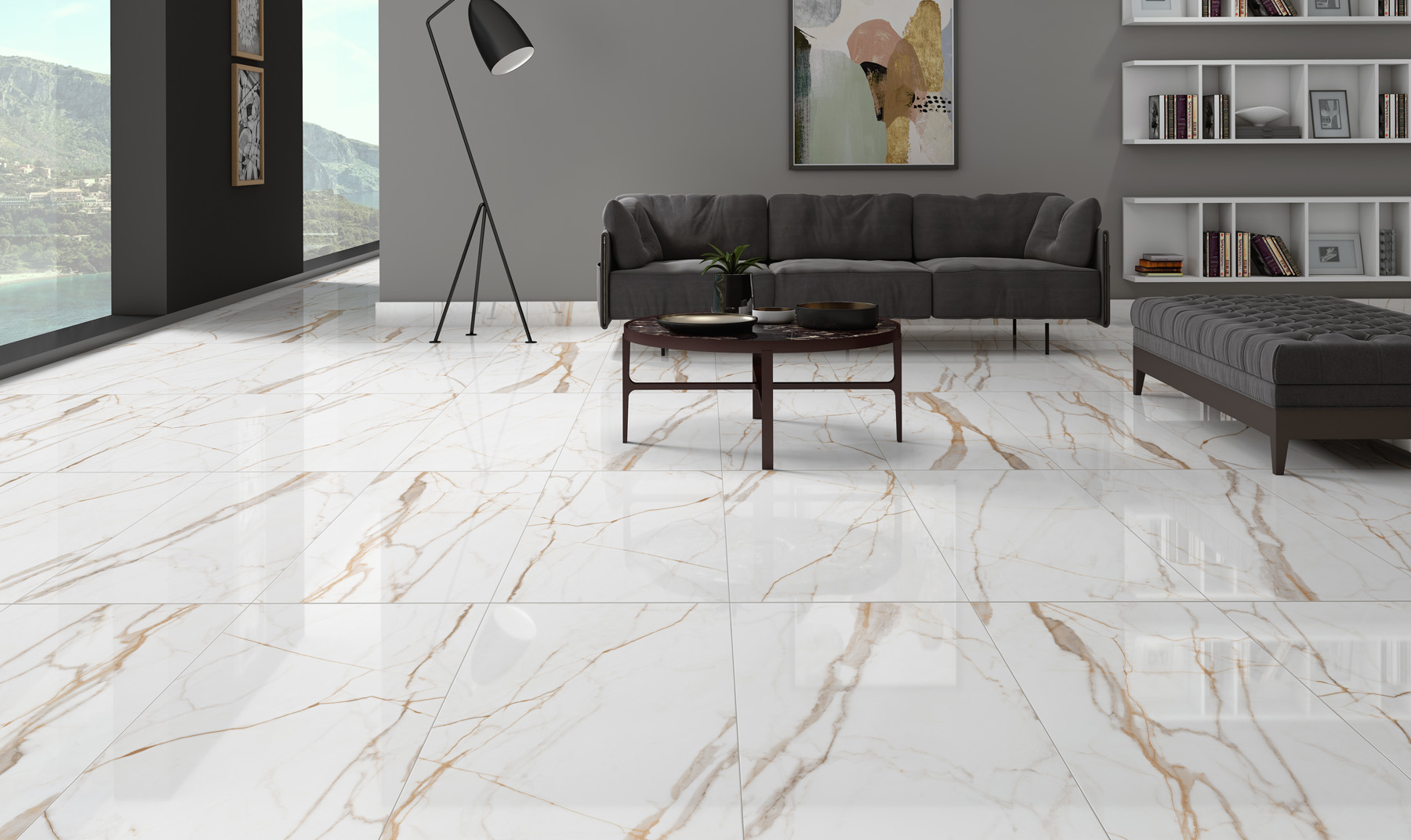 Calcatta Oro polished porcelain tile showcases a luxurious white and golden marble look, bringing warmth and radiance to any interior space. Its high-gloss finish enhances the natural veining, where delicate golden streaks dance across a luminous white background, capturing the elegance of premium marble. Designed for indoor use, the tile’s reflective surface amplifies light and creates an impression of spaciousness, making it ideal for living rooms, kitchens, bathrooms, and feature walls. Combining timeless beauty with the strength and easy maintenance of porcelain, it delivers a sophisticated, high-end aesthetic suited for both modern and classic interiors.