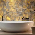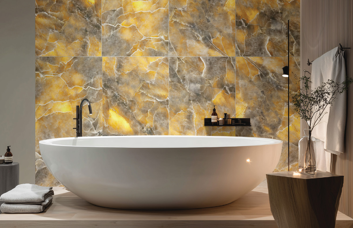Rainbow Glitter Tech Technology is an innovative surface treatment technique that combines digital inkjet technology with modern materials science. By using high-precision digital glue positioning technology, special crystal granules are precisely stacked onto the tile surface, which, after hightemperature sintering, form a translucent, three-dimensional crystal effect. In low-light environments, the surface presents a soft, misty texture, while in direct strong light, millions of miniature prisms are instantly activated, sparkling like fragmented diamonds .This technique imparts the natural mineral texture and artistic depth of stone to the tile surface while offering practical benefits like high wear resistance and easy maintenance.