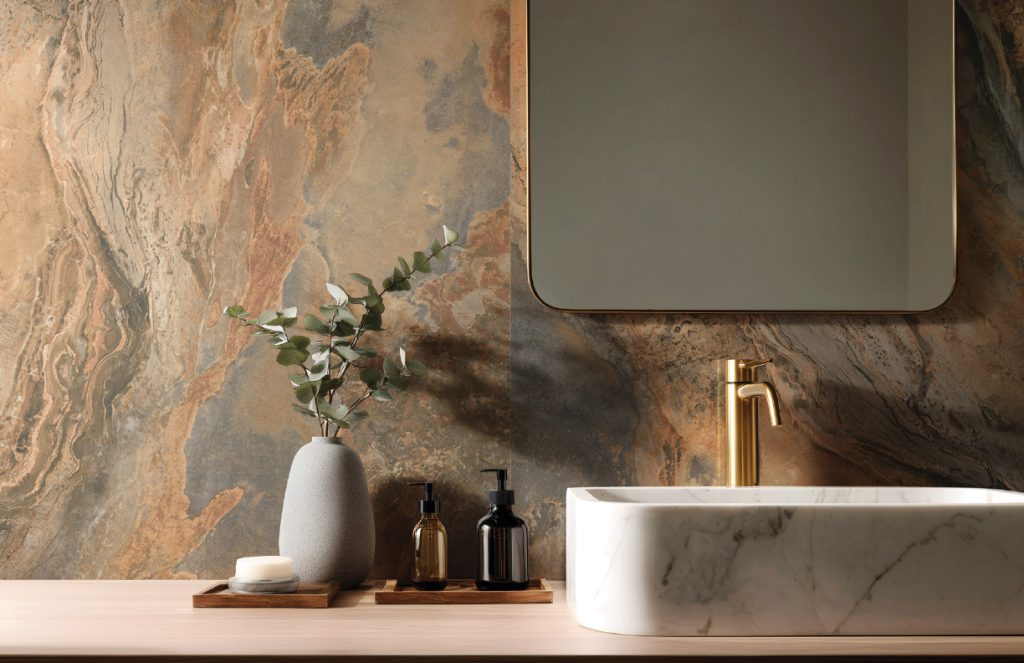 Rainbow Glitter Tech Technology is an innovative surface treatment technique that combines digital inkjet technology with modern materials science. By using high-precision digital glue positioning technology, special crystal granules are precisely stacked onto the tile surface, which, after hightemperature sintering, form a translucent, three-dimensional crystal effect. In low-light environments, the surface presents a soft, misty texture, while in direct strong light, millions of miniature prisms are instantly activated, sparkling like fragmented diamonds .This technique imparts the natural mineral texture and artistic depth of stone to the tile surface while offering practical benefits like high wear resistance and easy maintenance.