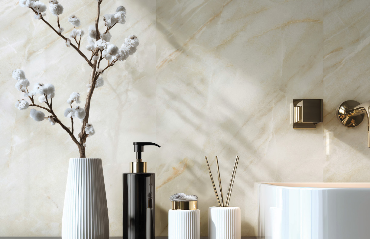 Rainbow Glitter Tech Technology is an innovative surface treatment technique that combines digital inkjet technology with modern materials science. By using high-precision digital glue positioning technology, special crystal granules are precisely stacked onto the tile surface, which, after hightemperature sintering, form a translucent, three-dimensional crystal effect. In low-light environments, the surface presents a soft, misty texture, while in direct strong light, millions of miniature prisms are instantly activated, sparkling like fragmented diamonds .This technique imparts the natural mineral texture and artistic depth of stone to the tile surface while offering practical benefits like high wear resistance and easy maintenance.